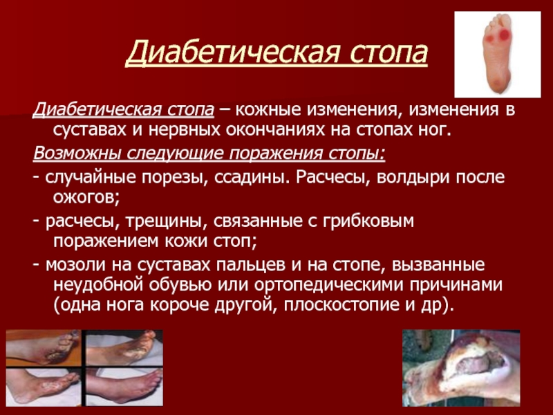 Диабетическая стопа – кожные изменения, изменения в суставах и