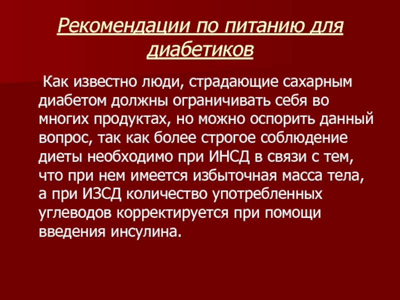 оспорить данный вопрос, так как более строгое соблюдение диеты необходимо при ИНСД в связи с тем, что при нем имеется избыточная масса тела, а при ИЗСД количество употребленных углеводов корректируется при помощи введения инсулина.