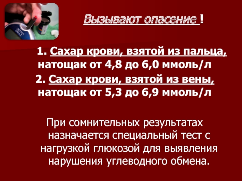 При сомнительных результатах назначается специальный тест c нагрузкой глюкозой для выявления нарушения углеводного обмена.