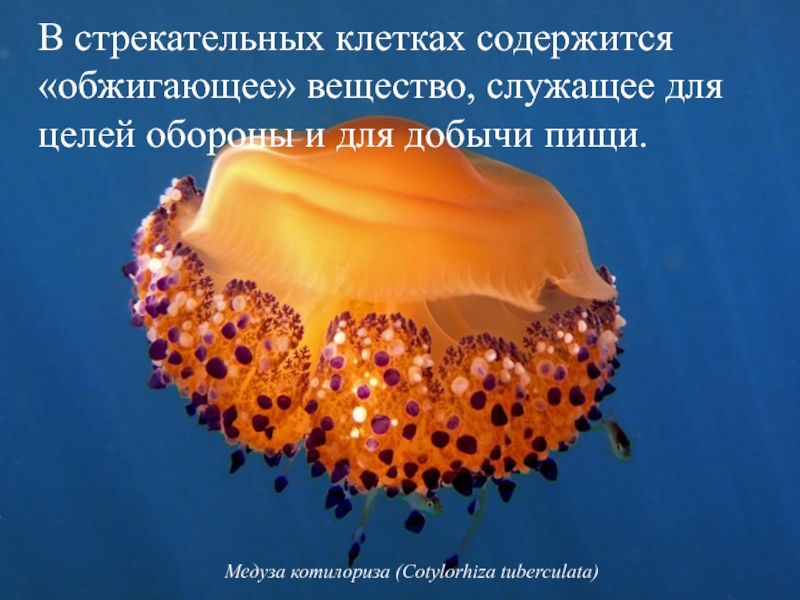 Медуза котилориза (Cotylorhiza tuberculata)В стрекательных клетках содержится «обжигающее» вещество, служащее для целей обороны и для добычи пищи.