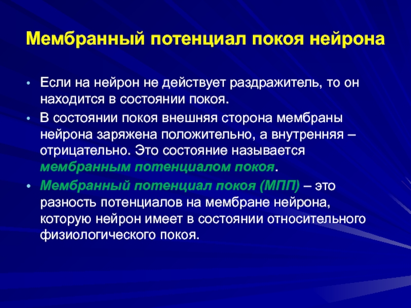 Мембранный потенциал покоя (МПП) – это разность потенциалов на мембране нейрона, которую нейрон имеет в состоянии относительного физиологического покоя.