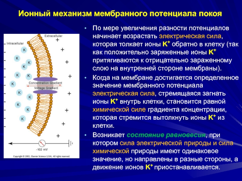 (так как положительно заряженные ионы K+ притягиваются к отрицательно зараженному слою на внутренней стороне мембраны).