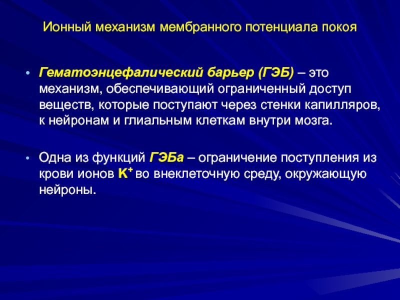Одна из функций ГЭБа – ограничение поступления из крови ионов K+ во внеклеточную среду, окружающую нейроны.