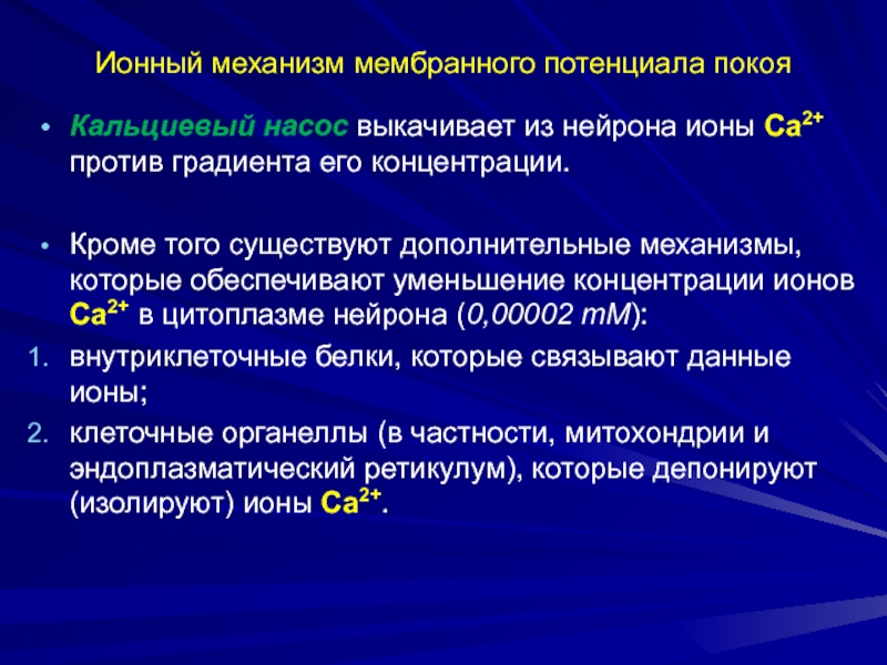 которые обеспечивают уменьшение концентрации ионов Ca2+ в цитоплазме нейрона (0,00002 mM):