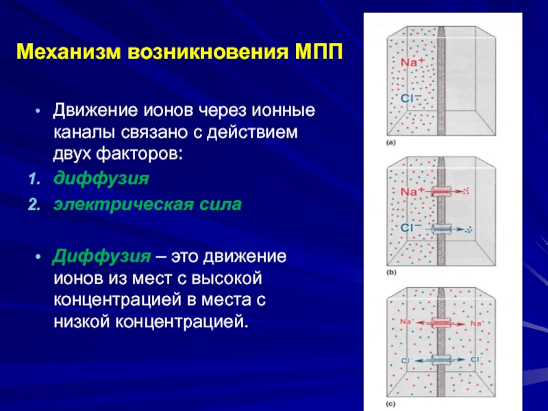 ионов из мест c высокой концентрацией в места с низкой концентрацией.