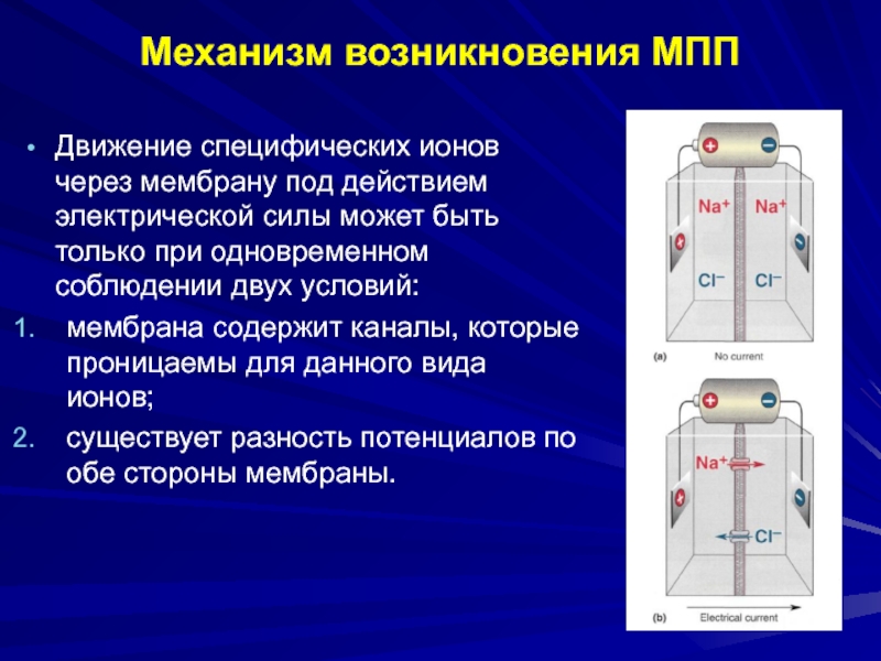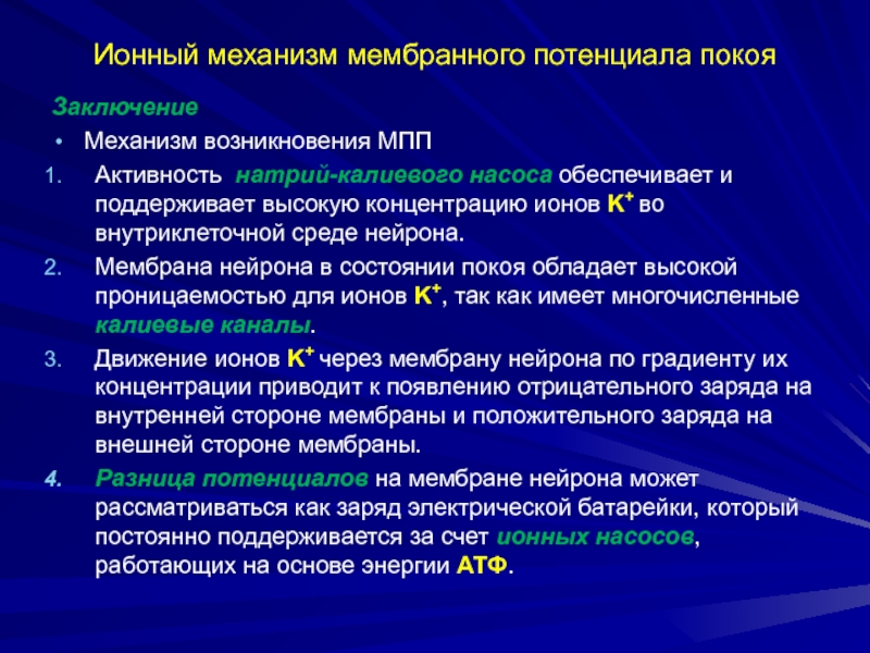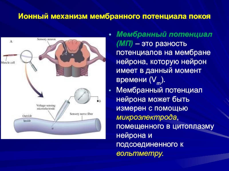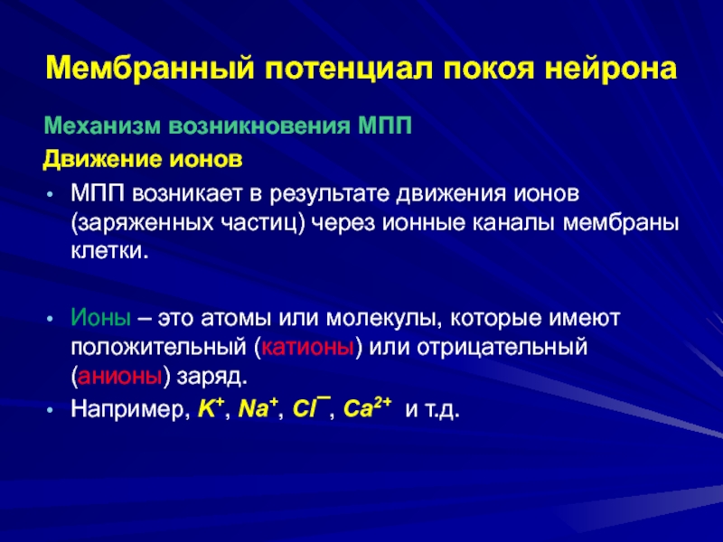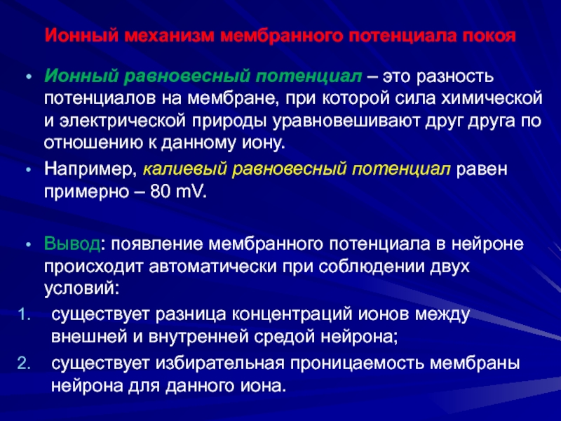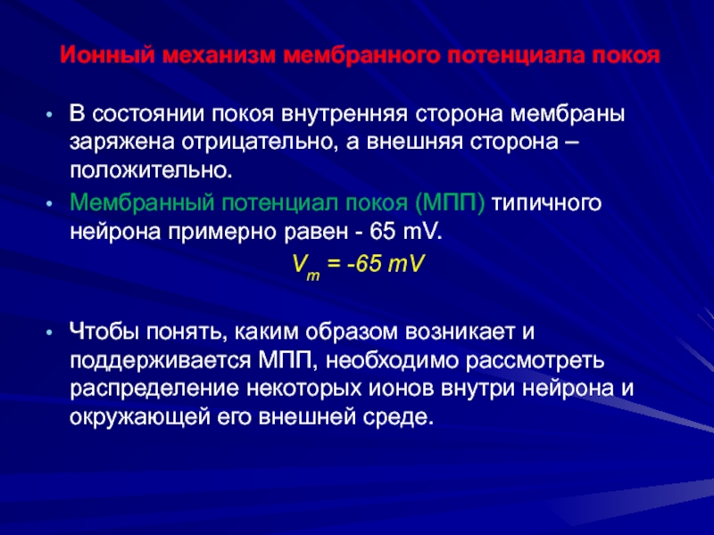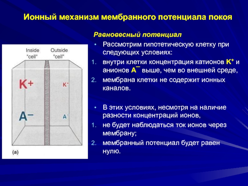 Слайд 28Ионный механизм мембранного потенциала покоя