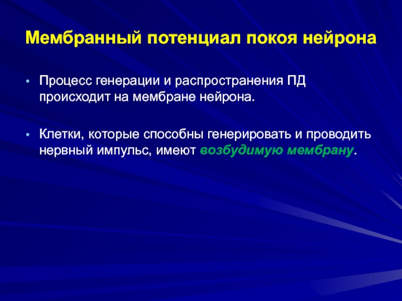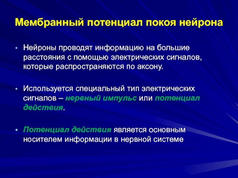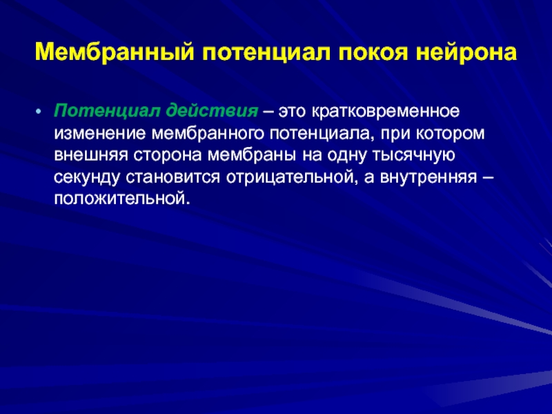 сторона мембраны нейрона заряжена положительно, а внутренняя – отрицательно. Это состояние называется мембранным потенциалом покоя.