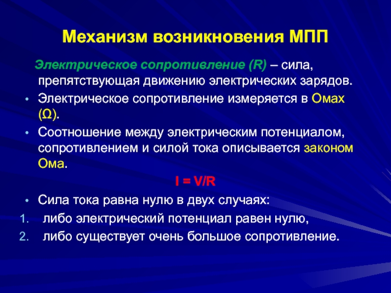 Соотношение между электрическим потенциалом, сопротивлением и силой тока описывается законом Ома.