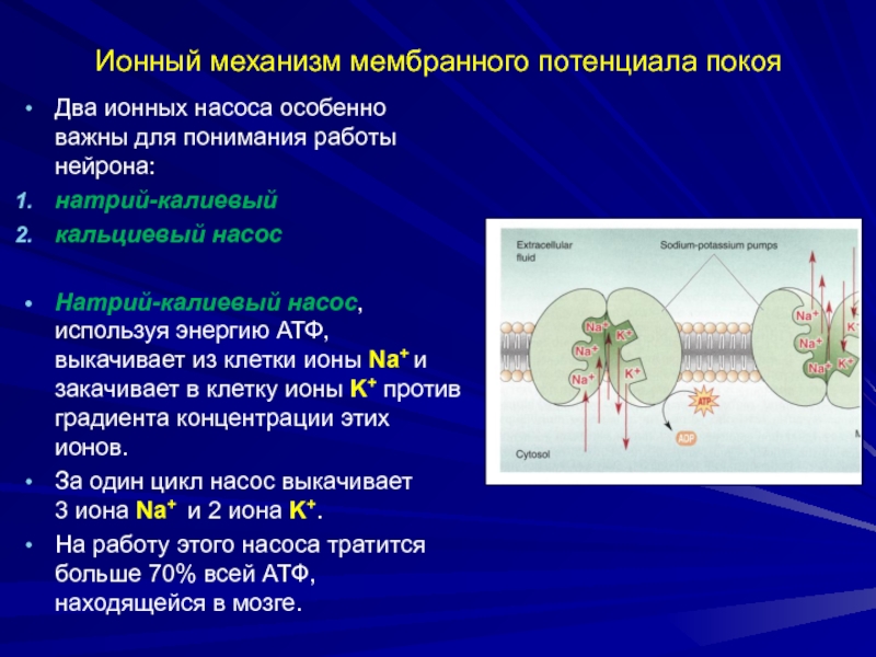 Разница концентраций различных ионов возникает в результате работы нескольких ионных насосов, которые встроены в мембрану нейрона.
