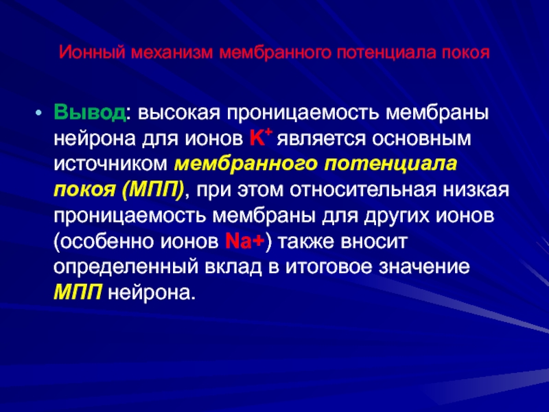 этом относительная низкая проницаемость мембраны для других ионов (особенно ионов Na+) также вносит определенный вклад в итоговое значение МПП нейрона.