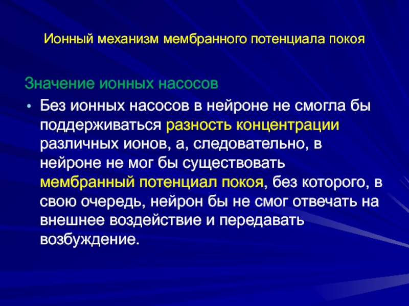 следовательно, в нейроне не мог бы существовать мембранный потенциал покоя, без которого, в свою очередь, нейрон бы не смог отвечать на внешнее воздействие и передавать возбуждение.