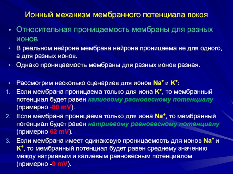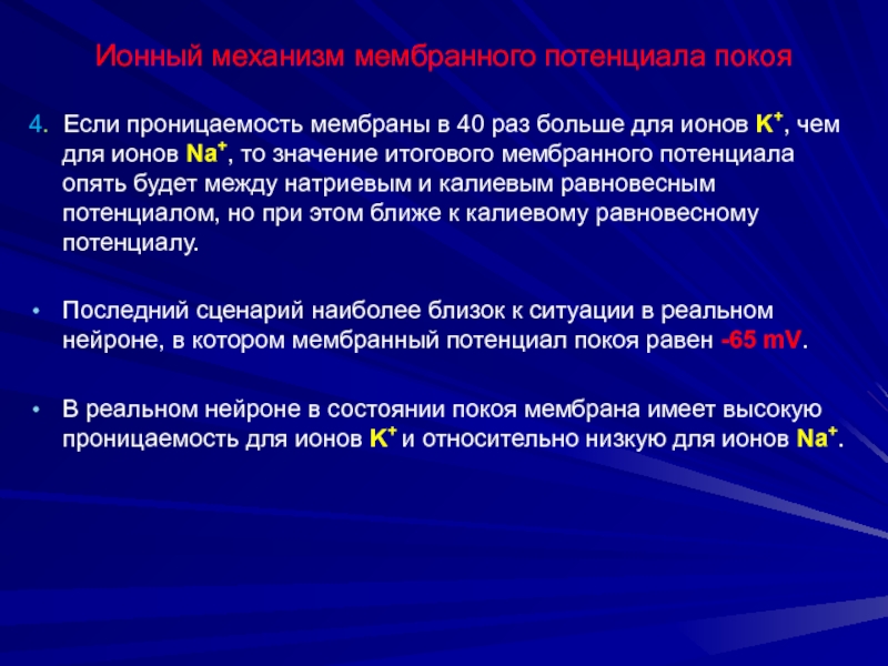 В реальном нейроне в состоянии покоя мембрана имеет высокую проницаемость для ионов K+ и относительно низкую для ионов Na+.