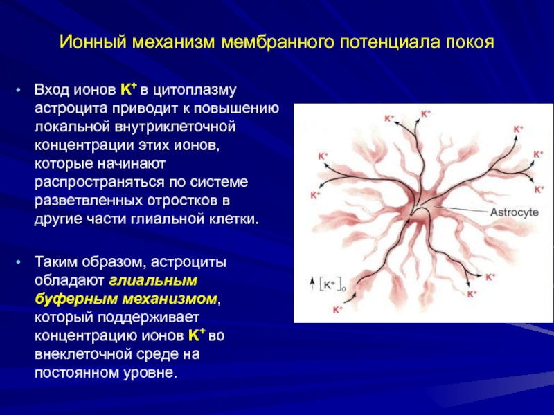 Таким образом, астроциты обладают глиальным буферным механизмом, который поддерживает концентрацию ионов K+ во внеклеточной среде на постоянном уровне.