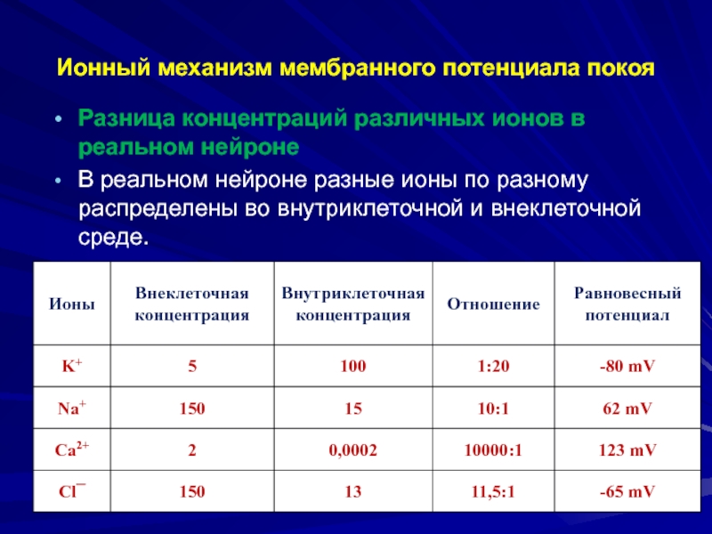 В реальном нейроне разные ионы по разному распределены во внутриклеточной