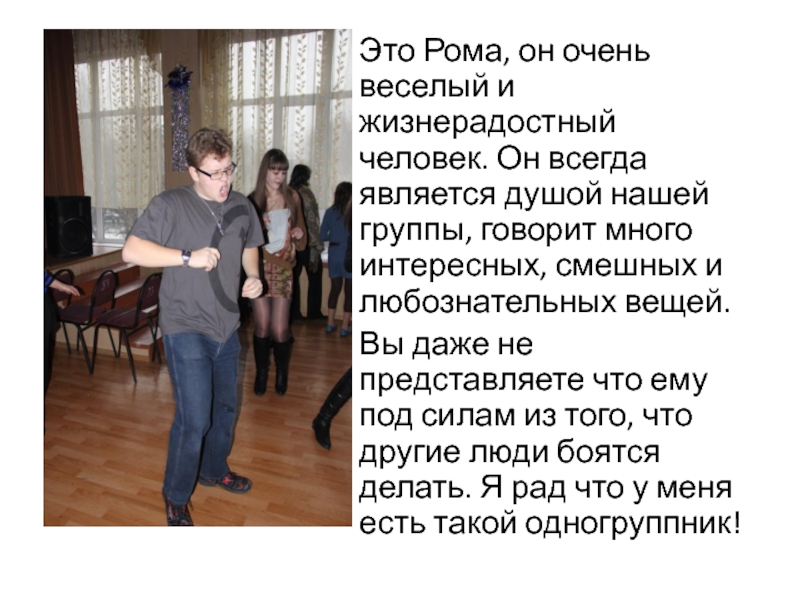 всегда является душой нашей группы, говорит много интересных, смешных и