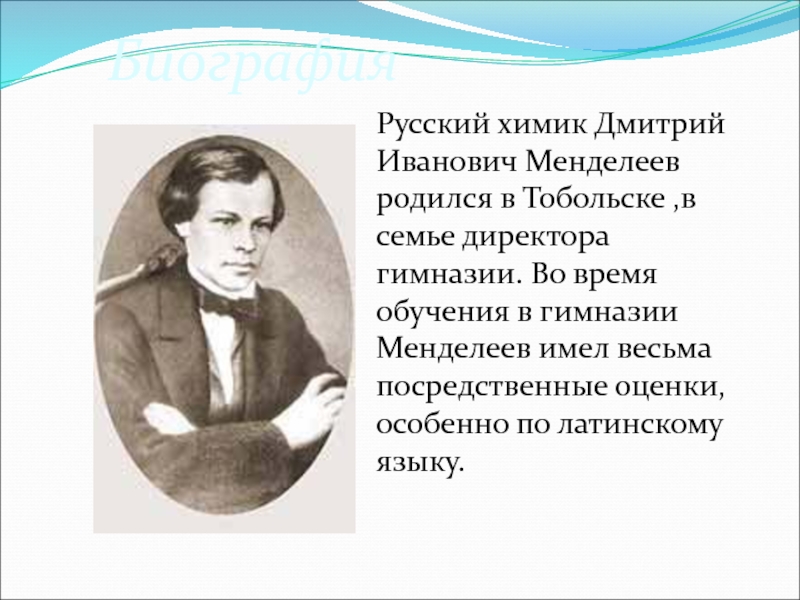 Русский химик Дмитрий Иванович Менделеев родился в Тобольске ,в семье