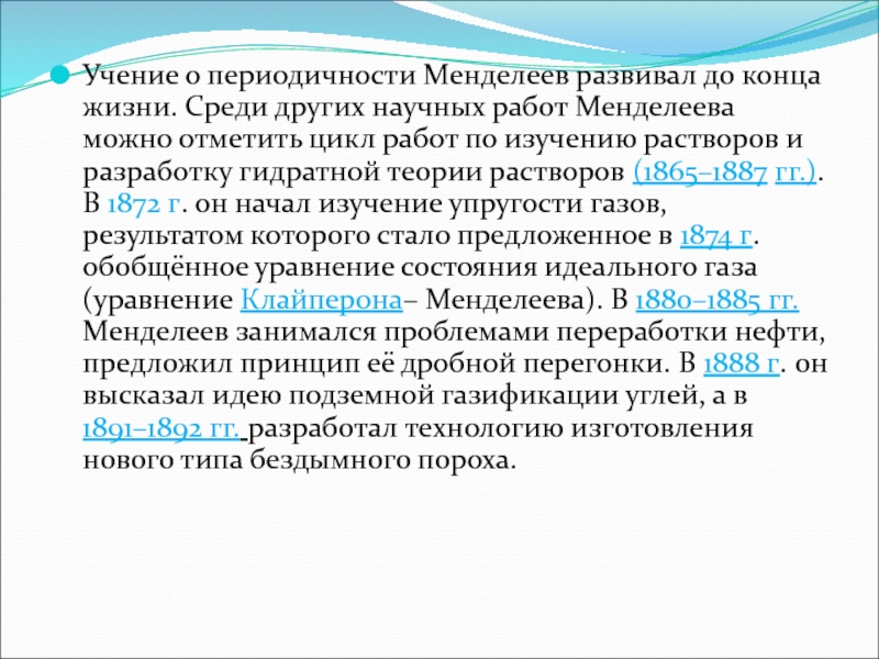 и разработку гидратной теории растворов (1865–1887 гг.). В 1872 г. он начал изучение упругости газов, результатом которого стало предложенное в 1874 г. обобщённое уравнение состояния идеального газа (уравнение Клайперона– Менделеева). В 1880–1885 гг. Менделеев занимался проблемами переработки нефти, предложил принцип её дробной перегонки. В 1888 г. он высказал идею подземной газификации углей, а в 1891–1892 гг. разработал технологию изготовления нового типа бездымного пороха.