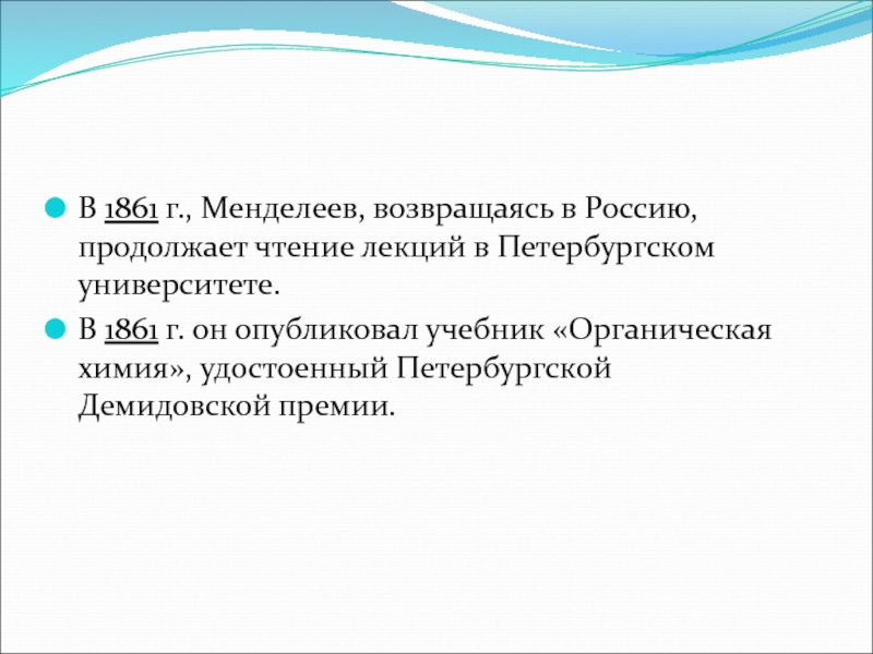 Слайд 6В 1861 г., Менделеев, возвращаясь в Россию, продолжает чтение лекций