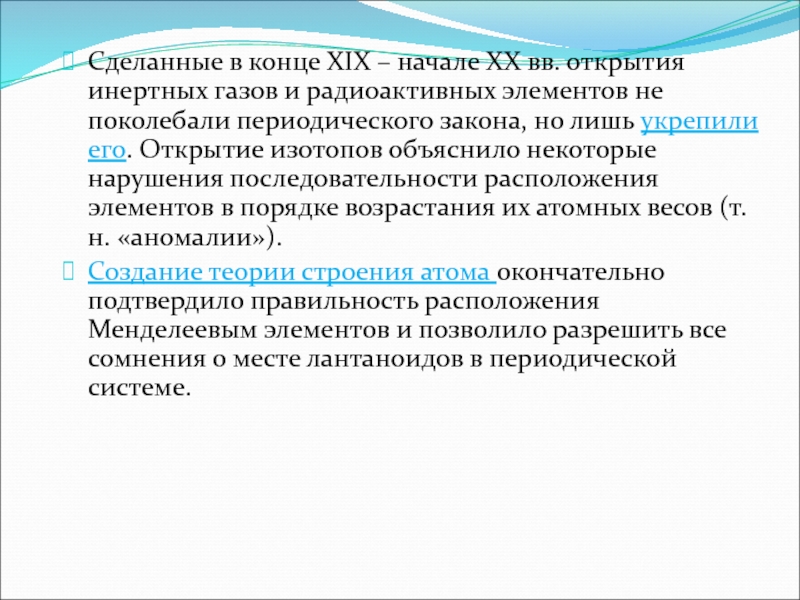 укрепили его. Открытие изотопов объяснило некоторые нарушения последовательности расположения элементов в порядке возрастания их атомных весов (т.н. «аномалии»).