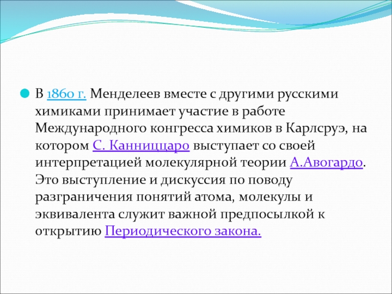 Канниццаро выступает со своей интерпретацией молекулярной теории А.Авогардо. Это выступление и дискуссия по поводу разграничения понятий атома, молекулы и эквивалента служит важной предпосылкой к открытию Периодического закона.