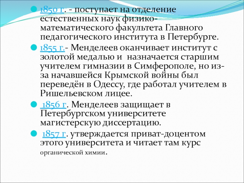 1855 г.- Менделеев оканчивает институт с