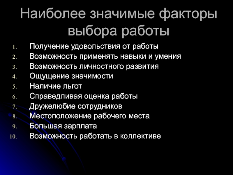 Наиболее значимые факторы выбора работыПолучение удовольствия от работыВозможность применять навыки и уменияВозможность личностного развитияОщущение значимостиНаличие льготСправедливая оценка