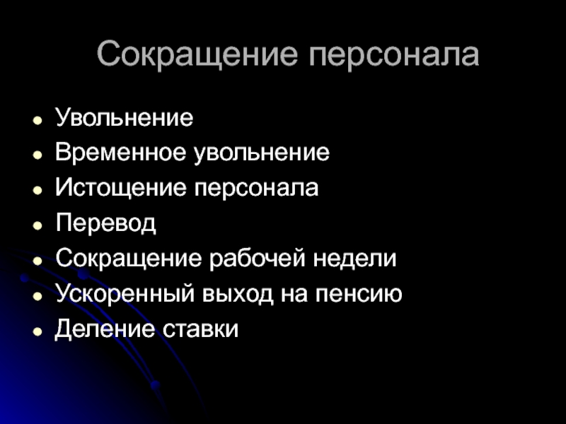 Сокращение персоналаУвольнениеВременное увольнениеИстощение персоналаПереводСокращение рабочей неделиУскоренный выход на пенсиюДеление ставки