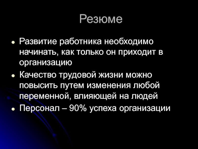 РезюмеРазвитие работника необходимо начинать, как только он приходит в организациюКачество трудовой жизни можно повысить путем изменения любой