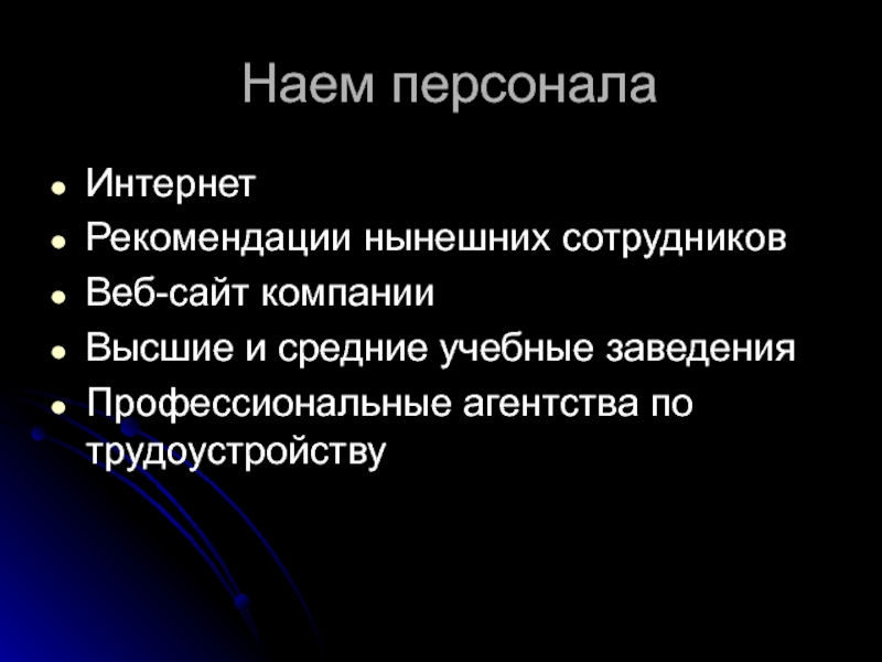Наем персоналаИнтернетРекомендации нынешних сотрудниковВеб-сайт компанииВысшие и средние учебные заведенияПрофессиональные агентства по трудоустройству