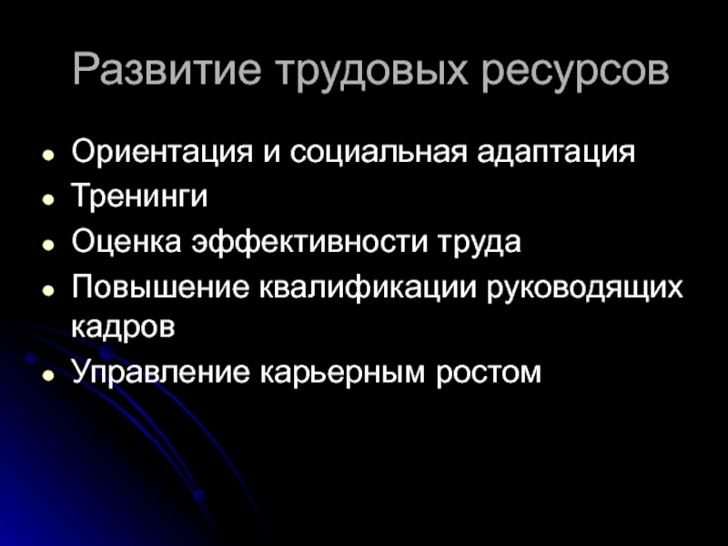 Развитие трудовых ресурсовОриентация и социальная адаптацияТренингиОценка эффективности трудаПовышение квалификации руководящих кадровУправление карьерным ростом