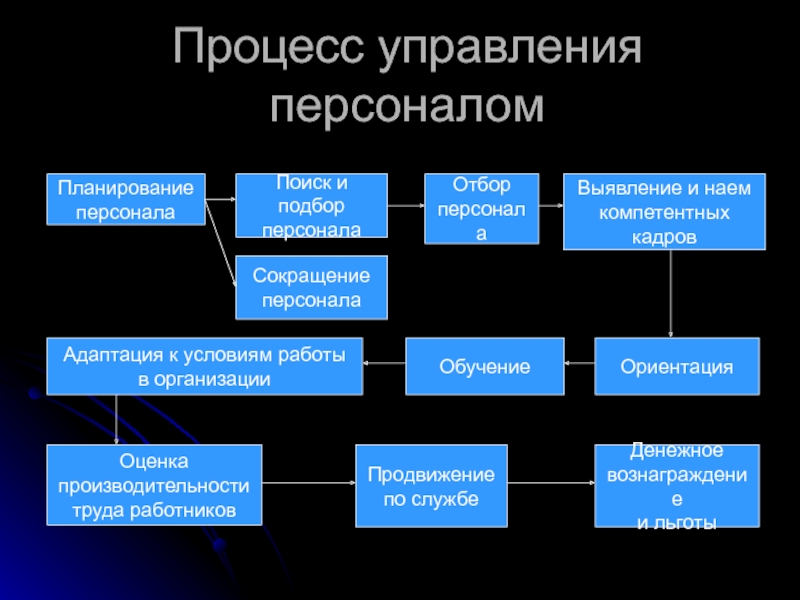 Процесс управления персоналомПланированиеперсоналаПоиск и подборперсоналаСокращениеперсоналаОтборперсоналаВыявление и наемкомпетентных кадровОриентацияОбучение Адаптация к условиям работыв организацииОценка производительноститруда работниковПродвижениепо службеДенежноевознаграждениеи льготы