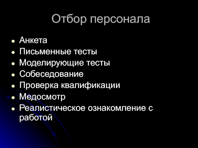 Отбор персоналаАнкетаПисьменные тестыМоделирующие тестыСобеседованиеПроверка квалификацииМедосмотр Реалистическое ознакомление с работой