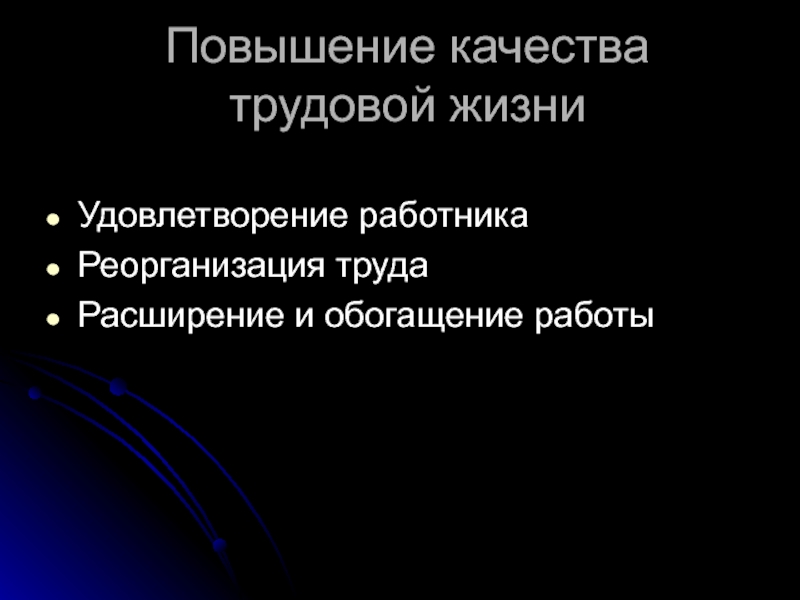 Повышение качества трудовой жизниУдовлетворение работникаРеорганизация трудаРасширение и обогащение работы