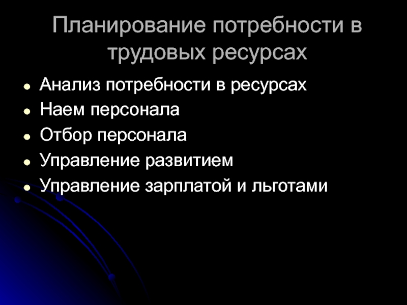 Планирование потребности в трудовых ресурсахАнализ потребности в ресурсахНаем персоналаОтбор персоналаУправление развитиемУправление зарплатой и льготами