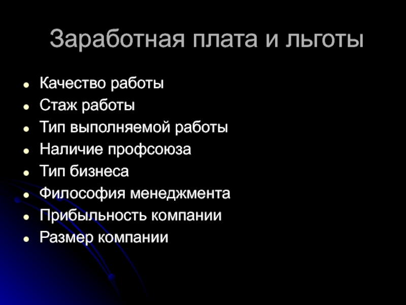 Заработная плата и льготыКачество работыСтаж работыТип выполняемой работыНаличие профсоюзаТип бизнесаФилософия менеджментаПрибыльность компанииРазмер компании