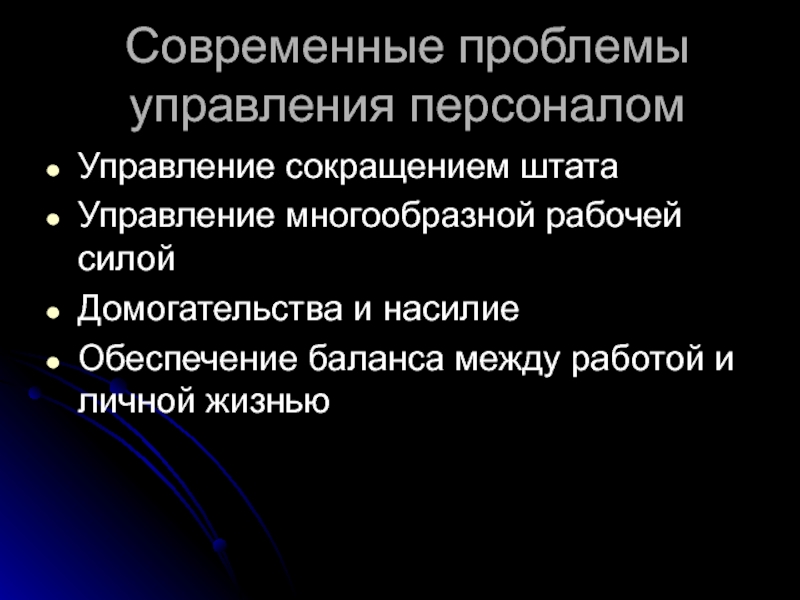 Современные проблемы управления персоналомУправление сокращением штатаУправление многообразной рабочей силойДомогательства и насилиеОбеспечение баланса между работой и личной жизнью