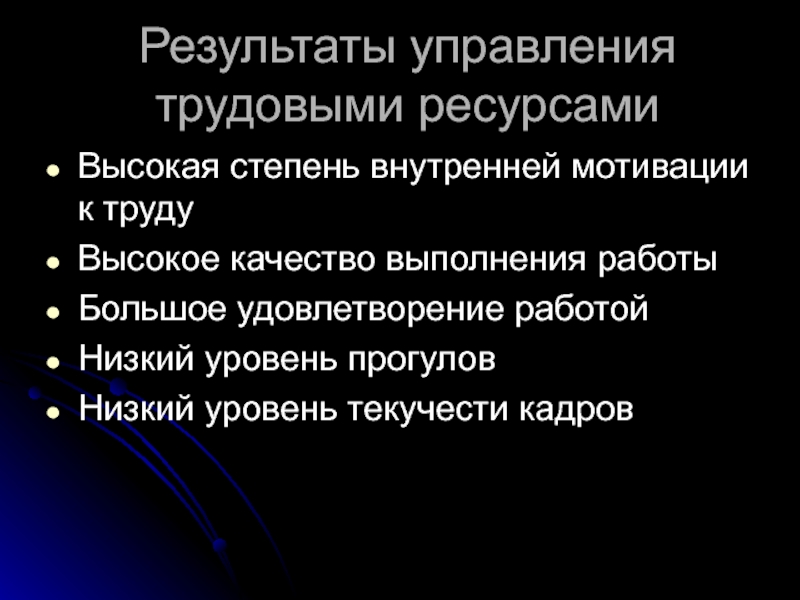 Результаты управления трудовыми ресурсамиВысокая степень внутренней мотивации к трудуВысокое качество выполнения работыБольшое удовлетворение работойНизкий уровень прогуловНизкий уровень