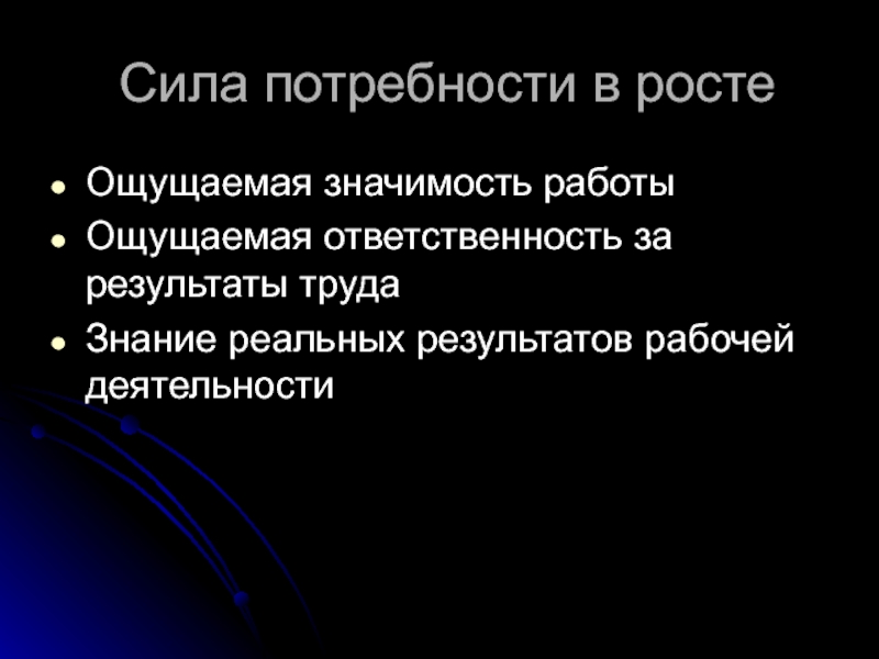 Сила потребности в ростеОщущаемая значимость работыОщущаемая ответственность за результаты трудаЗнание реальных результатов рабочей деятельности