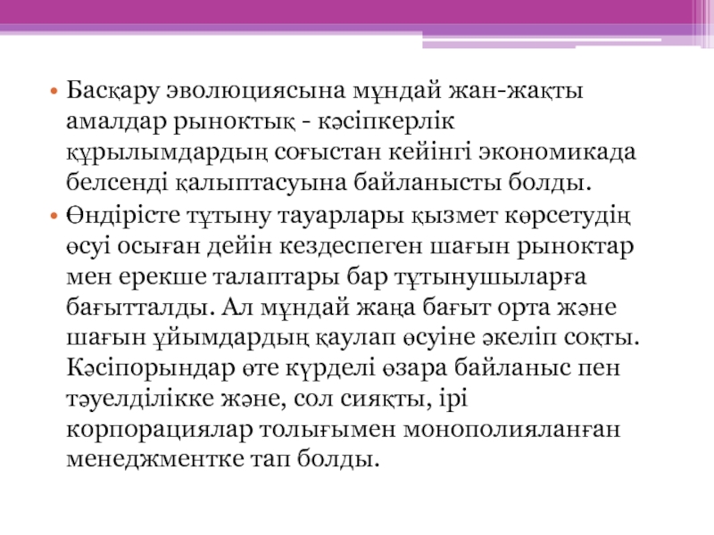 Слайд 9Басқару эволюциясына мұндай жан-жақты амалдар рыноктық - кәсіпкерлік құрылымдардың соғыстан