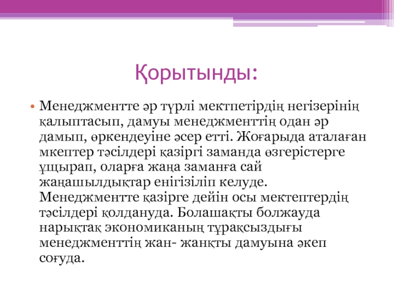 өзгерістерге ұщырап, оларға жаңа заманға сай жаңашылдықтар енігізіліп келуде. Менеджментте қазірге дейін осы мектептердің тәсілдері қолдануда. Болашақты болжауда нарықтақ экономиканың тұрақсыздығы менеджменттің жан- жанқты дамуына әкеп соғуда.