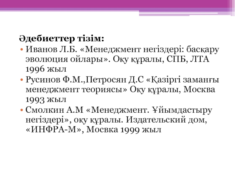 Иванов Л.Б. «Менеджмент негіздері: басқару эволюция ойлары». Оқу құралы,