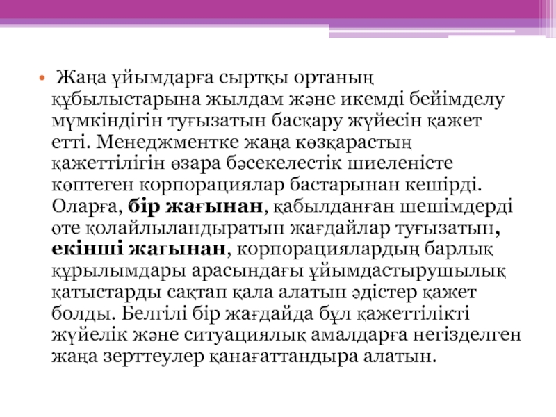 Слайд 10 Жаңа ұйымдарға сыртқы ортаның құбылыстарына жылдам және икемді бейімделу мүмкіндігін