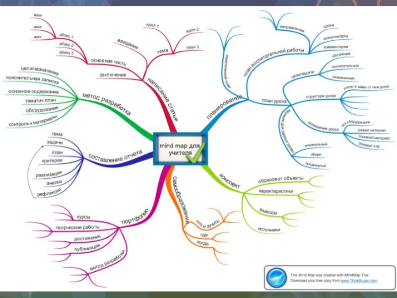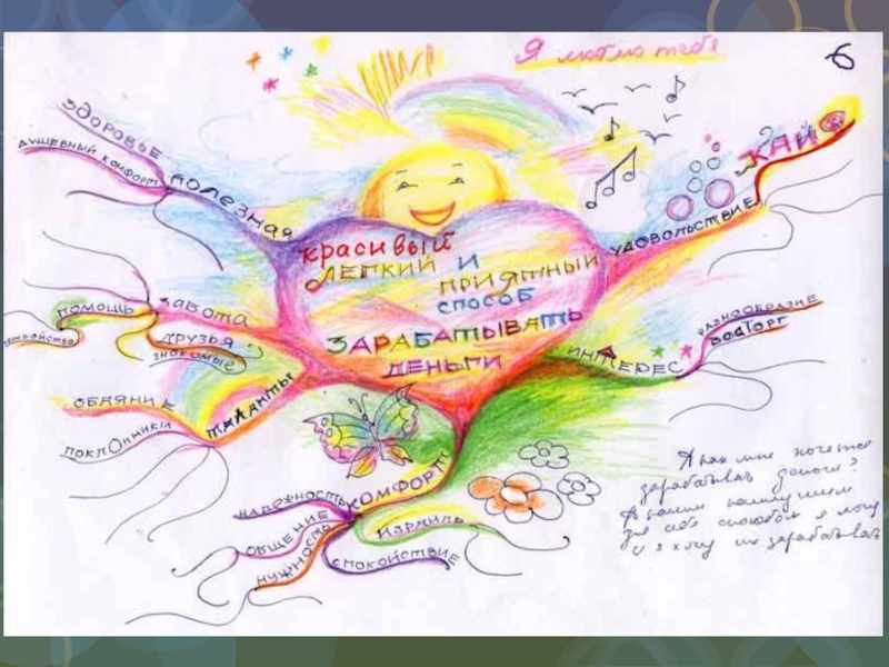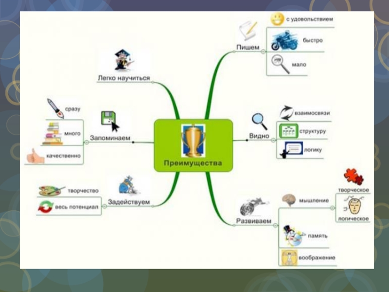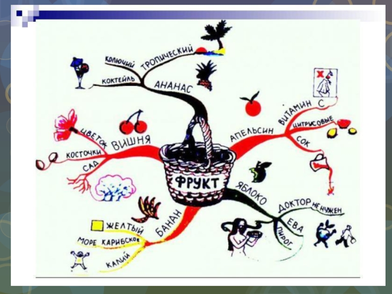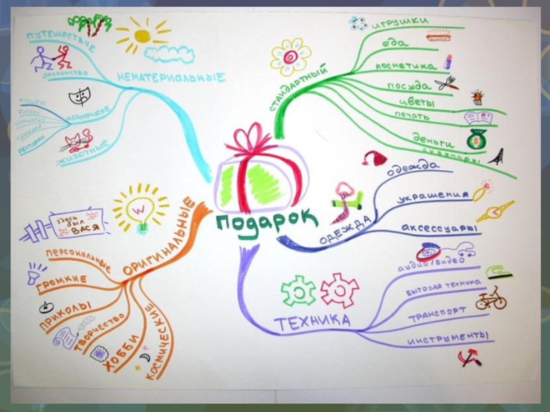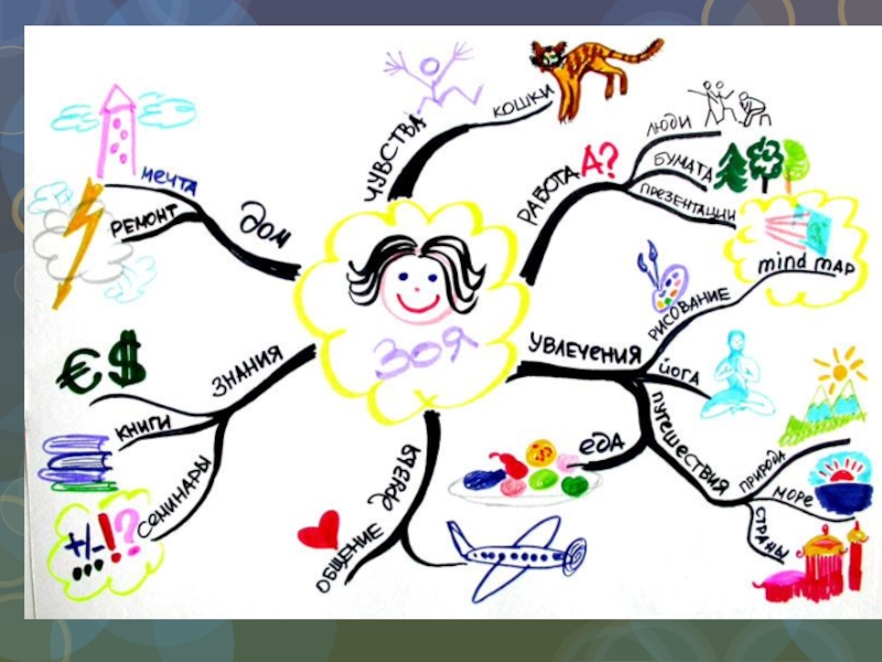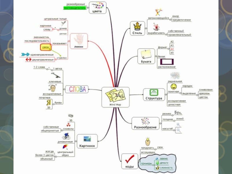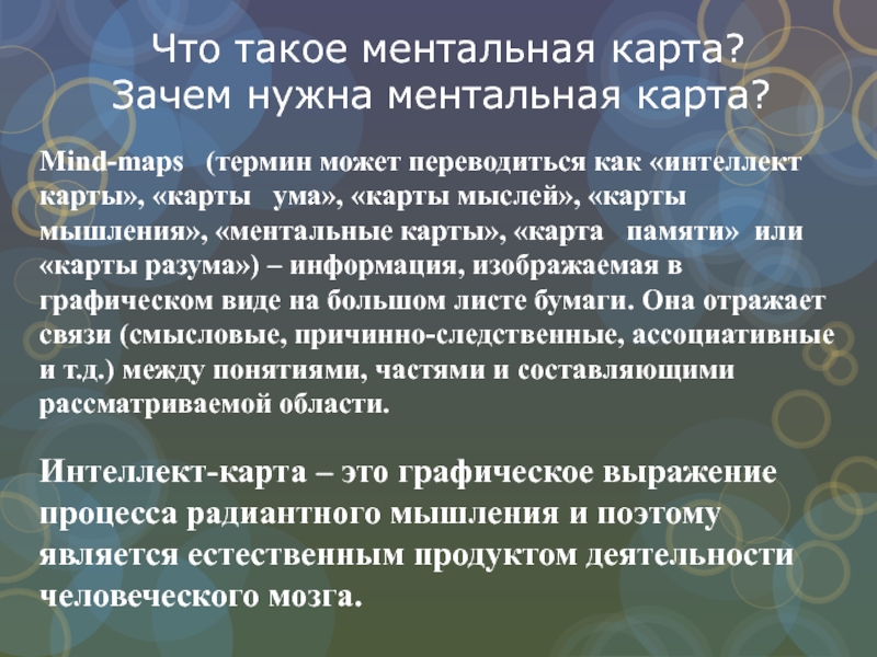 мыслей», «карты мышления», «ментальные карты», «карта памяти» или «карты разума») – информация, изображаемая в графическом виде на большом листе бумаги. Она отражает связи (смысловые, причинно-следственные, ассоциативные и т.д.) между понятиями, частями и составляющими рассматриваемой области.Интеллект-карта – это графическое выражение процесса радиантного мышления и поэтому является естественным продуктом деятельности человеческого мозга.