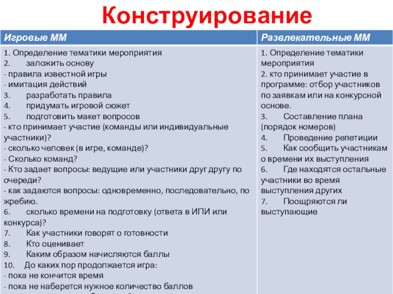 ПодготовкаСоздание команд (в играх)Реквизит (декорации и т.д.) Место проведенияТехника обеспечения (муз.аппаратура)Призы (в играх)ВедущиеЗрители (болельщики)ЖюриМатериальное обеспечение.При подготовке учитывать:1.       Контингент –
