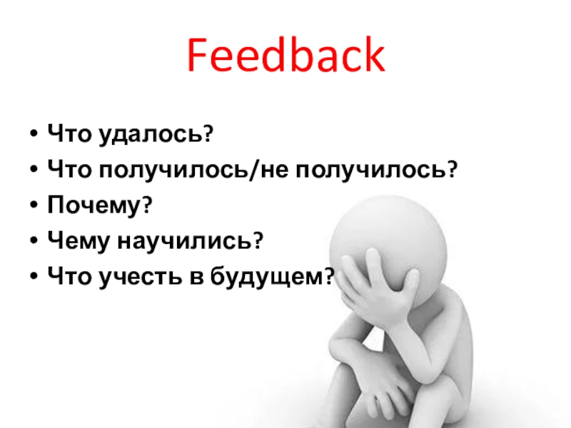 FeedbackЧто удалось?Что получилось/не получилось?Почему?Чему научились?Что учесть в будущем?