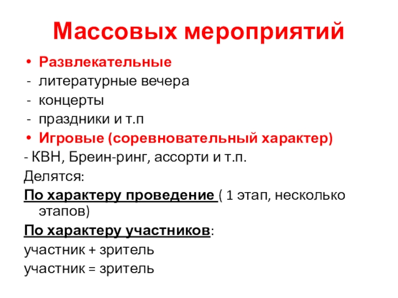 Массовых мероприятийРазвлекательные 		литературные вечераконцертыпраздники и т.пИгровые (соревновательный характер)- КВН, Бреин-ринг, ассорти и т.п.Делятся:По характеру проведение ( 1