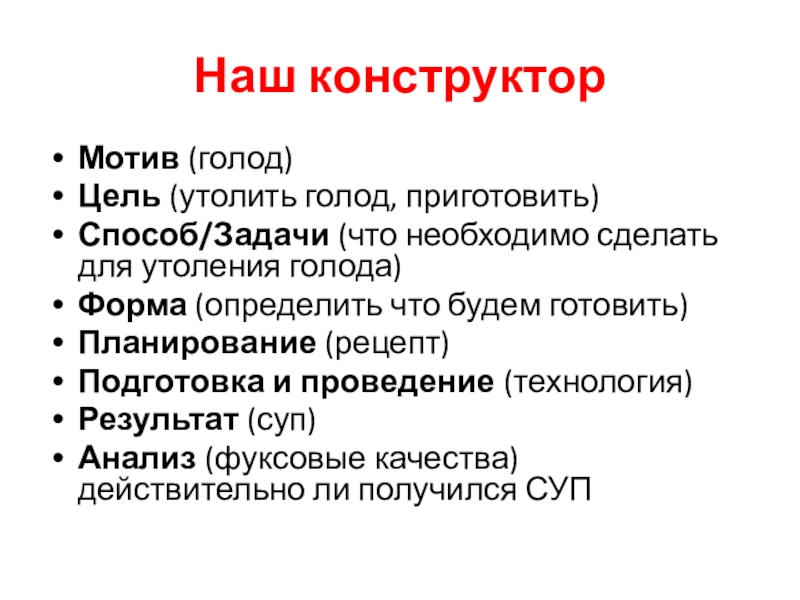 Наш конструкторМотив (голод)Цель (утолить голод, приготовить)Способ/Задачи (что необходимо сделать для утоления голода)Форма (определить что будем готовить)Планирование (рецепт)Подготовка
