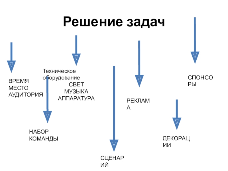 Решение задачВРЕМЯ МЕСТО АУДИТОРИЯТехническое оборудованиеСВЕТ МУЗЫКА АППАРАТУРАНАБОР КОМАНДЫРЕКЛАМАСПОНСОРЫДЕКОРАЦИИСЦЕНАРИЙ