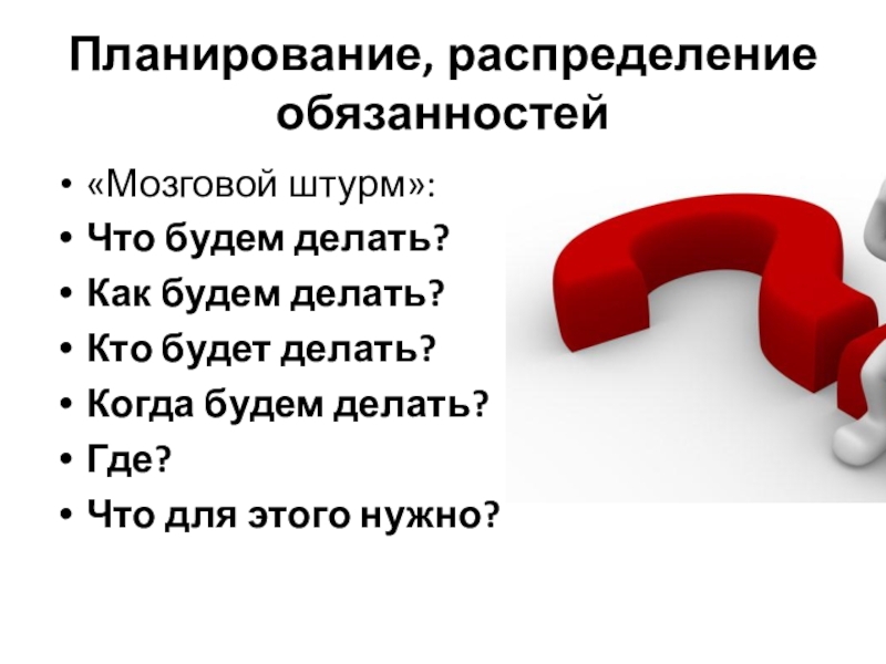 Планирование, распределение обязанностей«Мозговой штурм»:Что будем делать?Как будем делать?Кто будет делать?Когда будем делать?Где?Что для этого нужно?