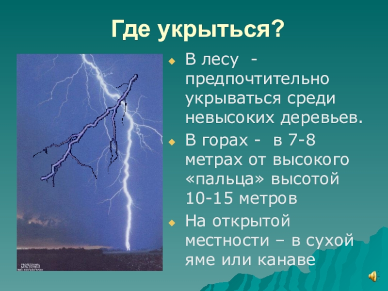 Где укрыться?В лесу -предпочтительно укрываться среди невысоких деревьев.В горах - в 7-8 метрах от высокого «пальца» высотой